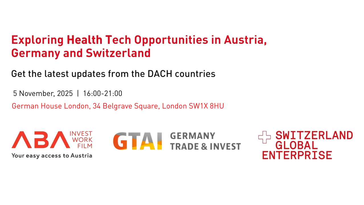 This forum - organised by Austrian Business Agency in collaboration with Advantage Austria, Germany Trade and Invest and Swiss Business Hub UK - is your occasion to explore business opportunities in the largest and most important healthtech region in Europe. Together, they represent over one-third of the European medical technology market, driven by world-leading companies, advanced healthcare infrastructure, and a robust industrial base. For innovative MedTech providers from the UK, the DACH region offers exceptional potential for growth, collaboration, and market entry.