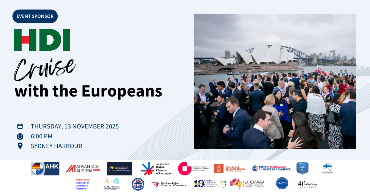 The Cruise with the Europeans, organised by the German-Australian Chamber of Industry and Commerce, has been a successful joint Chamber event for over 20 years now. With over 650 attendees & always sold out, the Cruise is a flagship European networking of the year. It provides an excellent chance to mingle among like-minded individuals, network, or just relax and enjoy the sights of the magnificent Sydney Harbour.