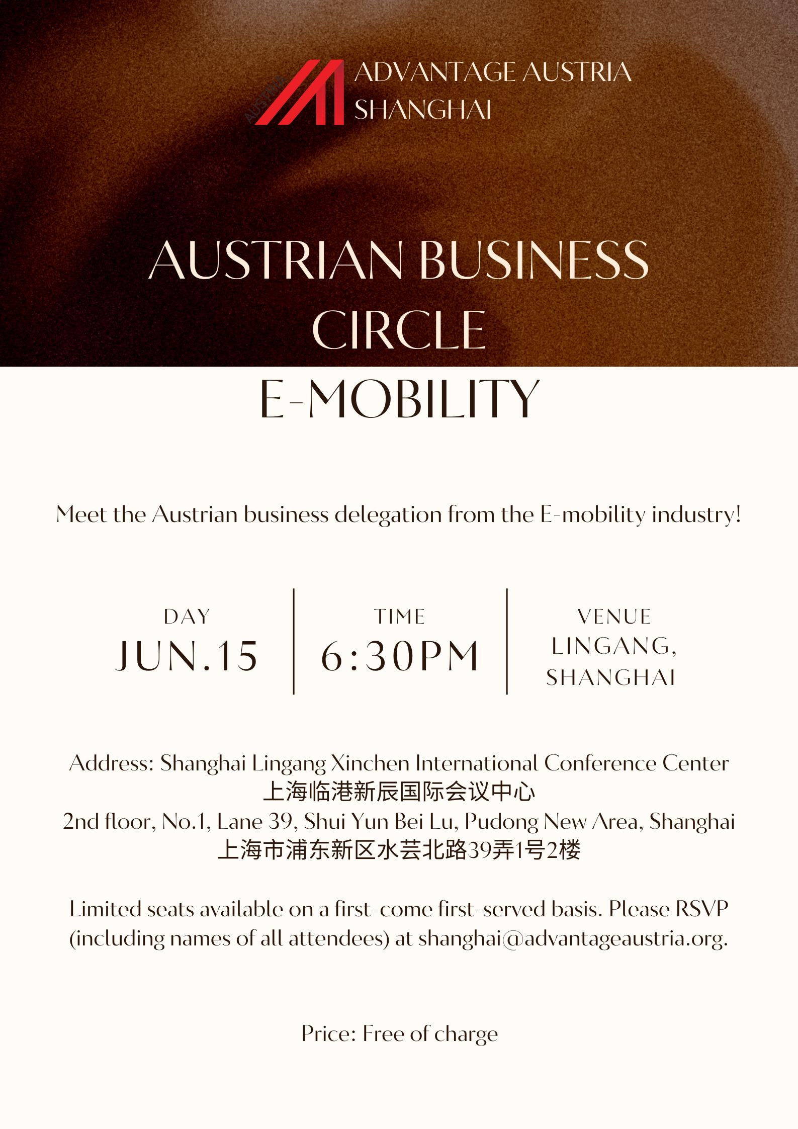 Limited seats available on a first-come first-served basis. Please RSVP (including the names of all attending persons) at shanghai@advantageaustria.org, Ms. Shengya Huang. We will send you a confirmation when your registration was successful.