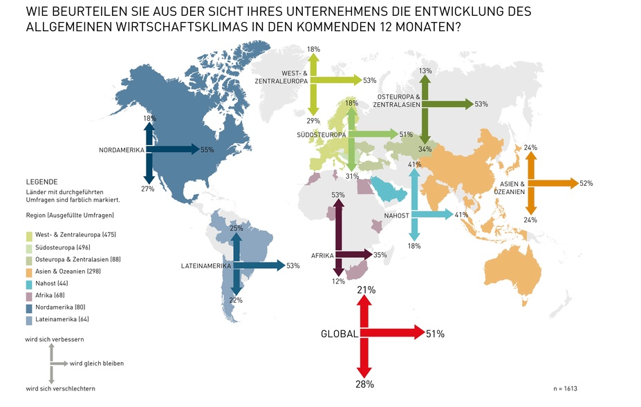 Hospodárske vyhliadky na rok 2026 sa v jednotlivých častiach sveta výrazne líšia: Na Blízkom východe a v Afrike prevláda citeľný optimizmus – mnoho spoločností pôsobiacich v oboch regiónoch očakáva zlepšenie podmienok a viac ako polovica respondentov v Afrike predpokladá lepšie vyhliadky. Oba regióny tak jasne prekračujú priemerné globálne očakávania.