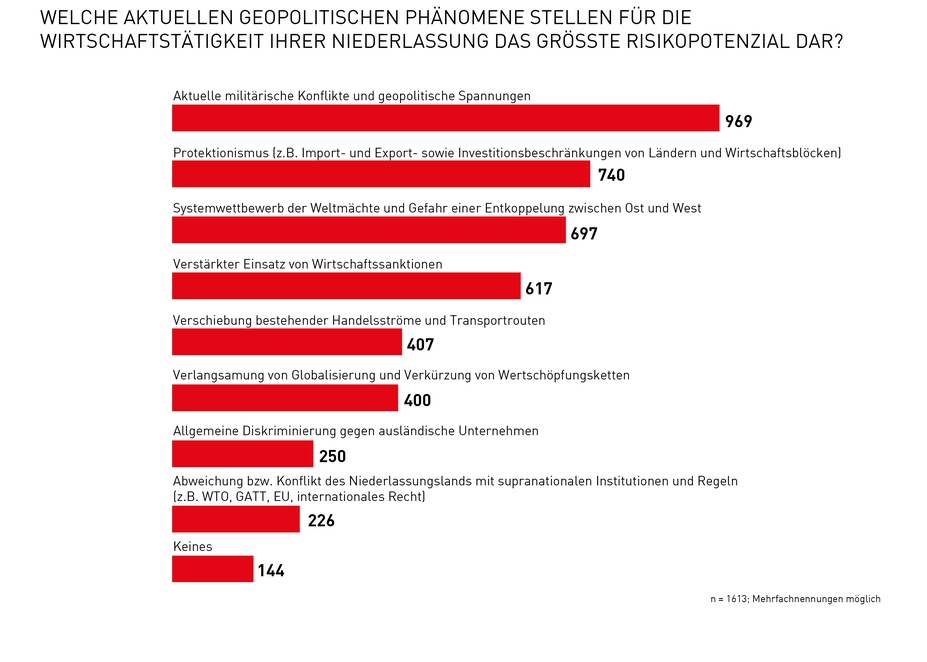 - Geopolitické riziká výrazne ovplyvňujú medzinárodné podnikateľské prostredie. Medzi najdôležitejšie rizikové faktory, ktoré ovplyvňujú spoločnosti na celom svete patria vojenské konflikty, geopolitické napätie, rastúci protekcionizmus a konkurencia svetových veľmocí. V Latinskej Amerike sa pozornosť zameriava najmä na otázky obchodnej politiky.